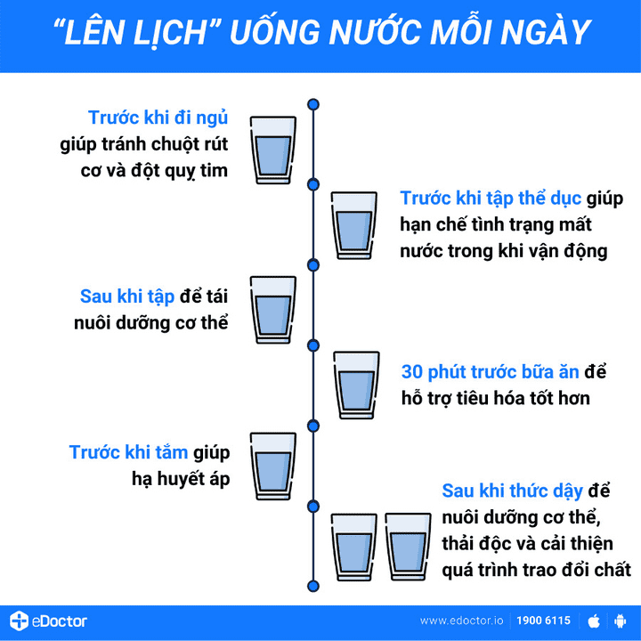 Hãy chủ động cung cấp nước cho cơ thể trước khi cảm thấy khát, dưới đây là các thời điểm đặc biệt cần uống nước: